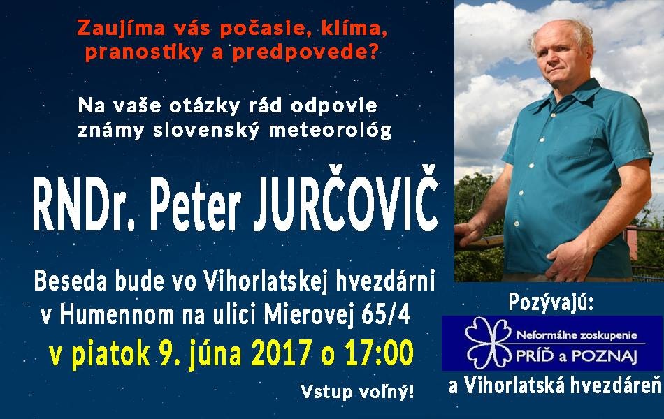 Vihorlatská hvezdáreň v spolupráci so združením Príď a poznaj zorganizovali besedu pre ľudí, ktorí sa zaujímajú o počasie, klímu či predpovede a pranostiky. Podujatie sa konalo vo Vihorlatskej hvezdárni v Humennom 9. júna 2017. Na otázky odpovedal známy slovenský meteorológ, RNDr. Peter Jurčovič. Účastníci besedy o počasí, predpovediach a pranostikách získali pamätný list z akcie s podpisom Petra Jurčoviča.