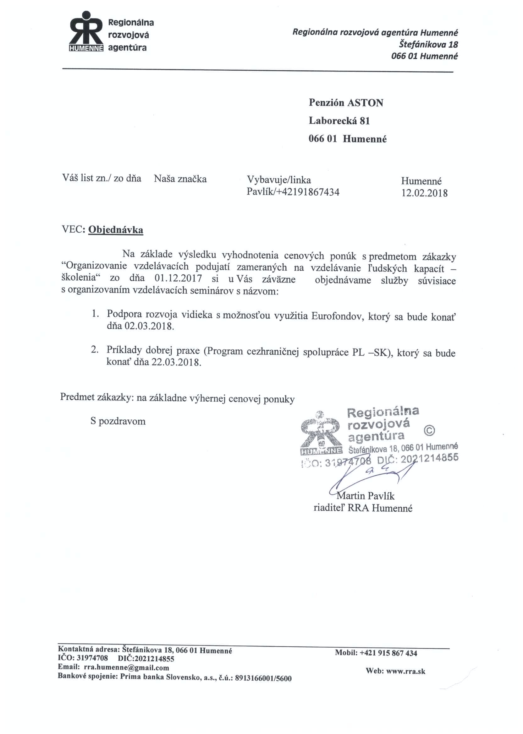 - Regionálny produkt - Objednávka č. 1/2016
