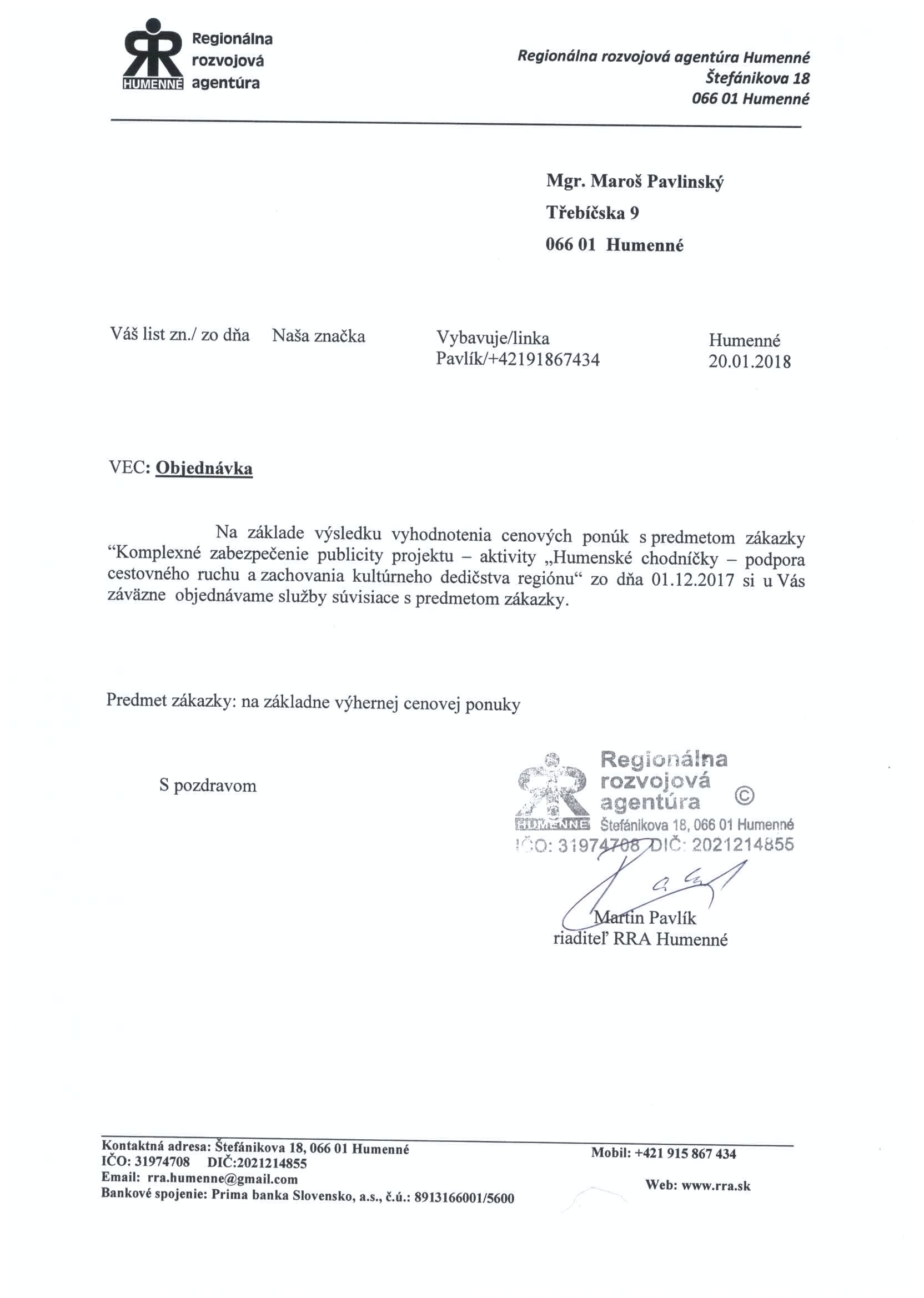 - Komplexné zabezpečenie publicity projektu - aktivity "Humenské chodníčky - podpora a zachovanie kultúrneho dedičstva regiónu"